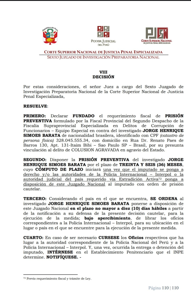“Declarar fundado el requerimiento fiscal de prisión preventiva formulado por la fiscal provincial del Segundo Despacho de la Fiscalía Supraprovincial Especializada en Delitos de Corrupción de Funcionarios – equipo especial en contra del investigado Jorge Henrique Simoes Barata de nacionalidad brasilera, identificado con cpf (catastro de persona física) 328.045.555.34, con domicilio en rua dr. renato paes de barros 130, apt. 131-itaim bibi – Sao Paulo sp – Brasil, por su presunta vinculación al delito de colusión agravada en agravio del Estado”, indica el primer punto de la resolución.