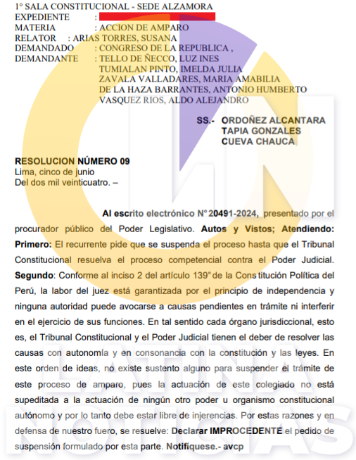 La Primera Sala Constitucional del Poder Judicial declaró improcedente el pedido presentado por la Procuraduría Pública del Congreso de la República para que se paralice el proceso de la demanda de amparo interpuesta por Inés Tello y Aldo Vásquez, quienes buscan ser reintegrados a la Junta Nacional de Justicia luego que fueron inhabilitados 10 años de la función pública.