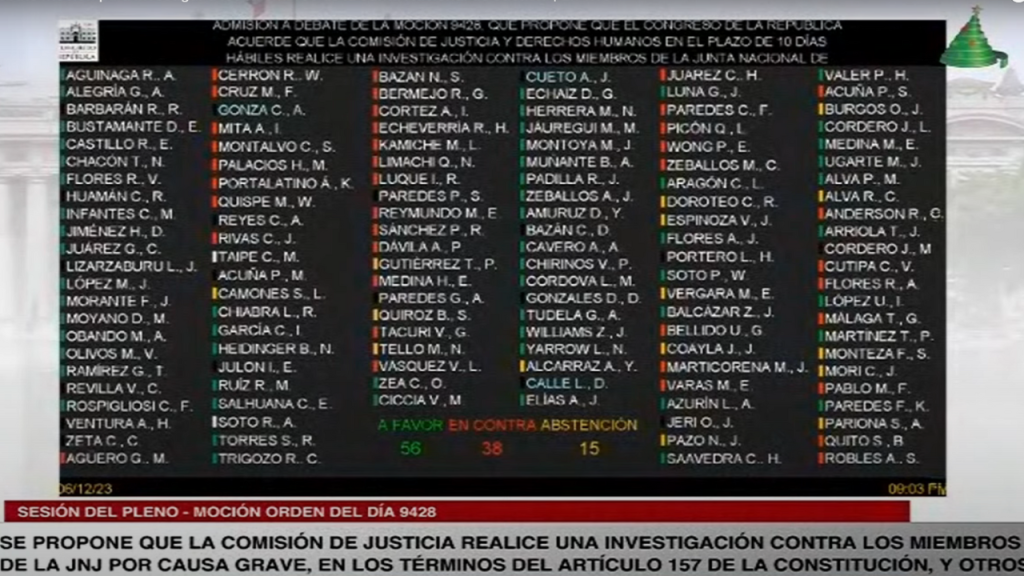 Con 56 a favor, 38 en contra y 15 abstenciones, el Pleno del Congreso de la República votó en contra de que se realice la investigación a los miembros de la JNJ.