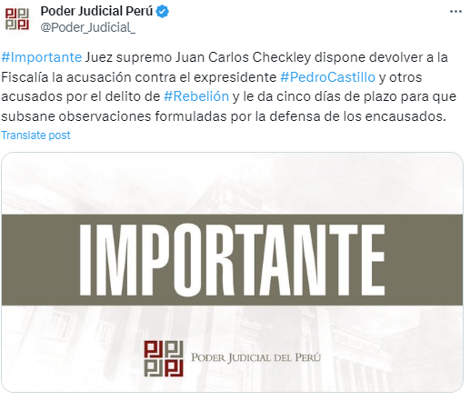 El Poder Judicial ha devuelto la acusación formulada por la Fiscalía contra el expresidente Pedro Castillo y otros implicados en el presunto delito de rebelión, y le otorga un plazo de cinco días para que se subsanen las observaciones planteadas por la defensa.