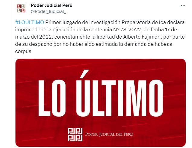 “Primer Juzgado de Investigación Preparatoria de Ica declara improcedente la ejecución de la sentencia N° 78-2022, de fecha 17 de marzo del 2022, concretamente la libertad de Alberto Fujimori, por parte de su despacho, por no haber sido estimada la demanda de habeas corpus”, comunicaron.