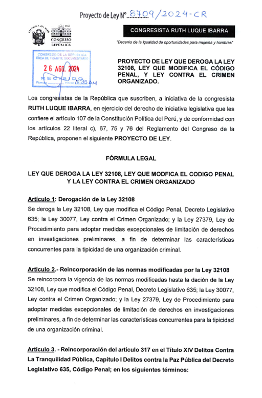 Presentan proyecto de ley para derogar norma que realiza modificaciones al crimen organizado