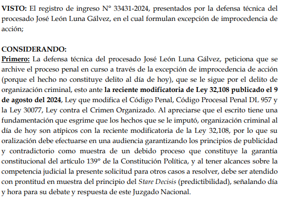 La defensa legal de Luna presentó el requerimiento de excepción de improcedencia de acción ante el Séptimo Juzgado de Investigación Preparatoria Nacional, cuyo magistrado titular es Jorge Luis Chávez Tamariz, que lo admitió a trámite y convocó a una audiencia para analizar este pedido el próximo 29 de agosto a las 9 de la mañana.