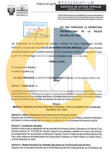 En el Congreso de la República se ha presentado un proyecto de ley que dispone el pase extraordinario de agentes de la Policía Nacional del Perú al retiro. La iniciativa viene del congresista Elvis Vergara de la bancada Acción Popular.