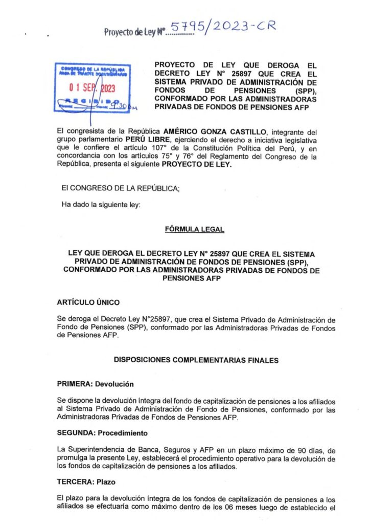 El Sistema Privado de Pensiones (SPP) está en la mira de Perú Libre. El congresista Américo Gonza presentó un proyecto de ley que apunta eliminar las Administradoras Privadas de Fondos de Pensiones (AFP). Esta iniciativa legislativa busca derogar el Decreto Ley N.° 25897, y dispone la devolución íntegra de los fondos de capitalización de pensiones de los afiliados.