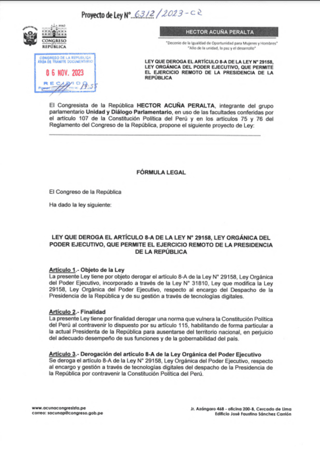 Héctor Acuña, miembro de Unidad y Diálogo Parlamentario, ha presentado un proyecto de ley que busca derogar una norma que permite a la presidenta Dina Boluarte ejercer el cargo de presidenta de la República de manera remota cuando se encuentre en el extranjero.