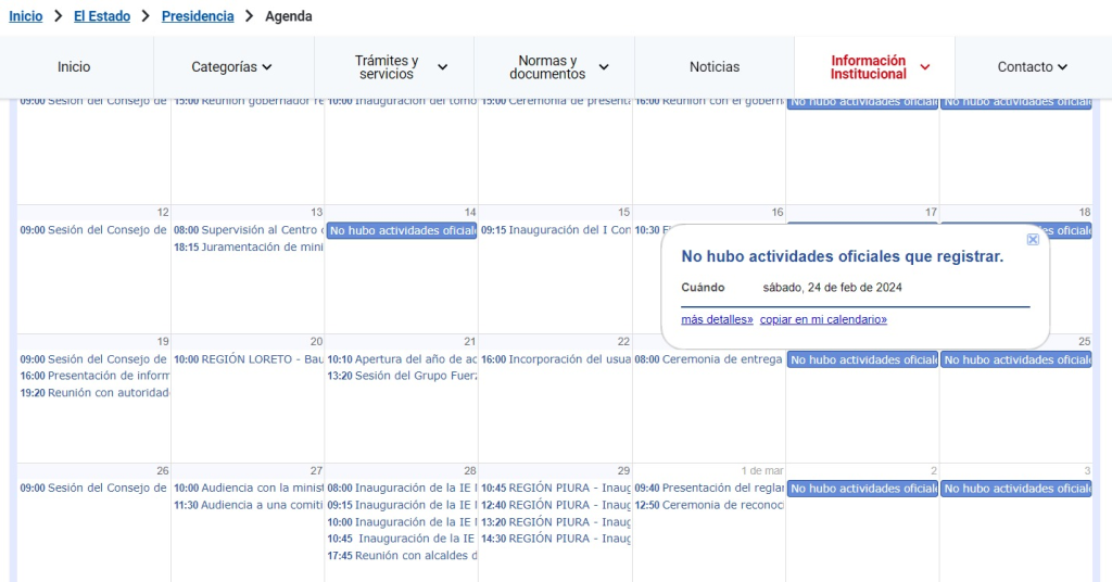 Sin embargo, Latina Noticias corroboró, a través del portal Transparencia, que la presidenta no realizó ninguna actividad oficial el sábado 24 de febrero. ¿Esto quiere decir que la presidenta estuvo en el lugar donde se escondía Vladimir Cerrón por motivos personales?