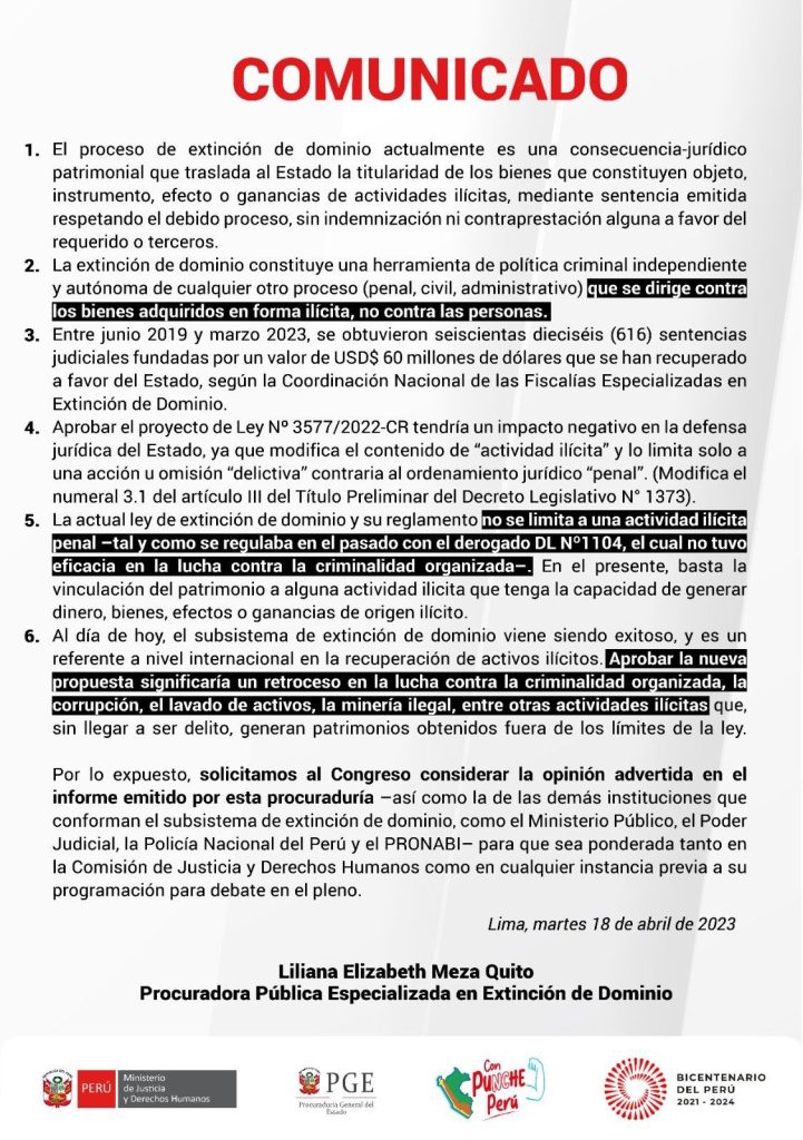 La Procuraduría de Extinción de Dominio ha expresado su preocupación por el impacto negativo que este proyecto de ley podría tener en la lucha contra la corrupción y ha instado al Congreso a considerar las implicancias y a convocar a expertos en el sistema de extinción de dominio para evaluar posibles modificaciones.