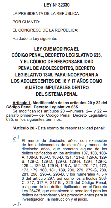 Se trata de la Ley N.º 32330, la cual fue publicada en el diario oficial El Peruano el sábado 10 de mayo. En ella se modifican los artículos 20 y 22 del Código Penal y el Código de Responsabilidad Penal de Adolescentes.