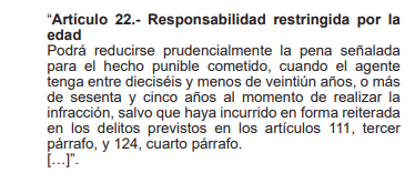 Mientras que el Artículo 22 de La Ley N.º 32330 especifica a su vez que “podrá reducirse prudencialmente la pena” si el agente que comete el delito tiene entre 16 y 21 años o es mayor de 65. “Salvo que haya incurrido en forma reiterada en los delitos previstos en los artículos 111, tercer párrafo, y 124, cuarto párrafo”, se precisa en la norma.