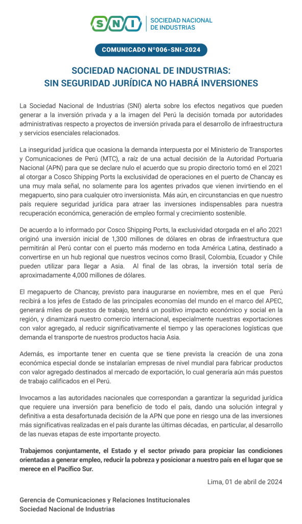Previamente, otro gremio importante que tuvo un pronunciamiento fue la Sociedad Nacional de Industrias. A través de un comunicado expresaron que la acción de la Procuraduría del MTC para anular la exclusividad a Cosco Shipping para operar en el megapuerto de Chancay genera una “inseguridad jurídica”.