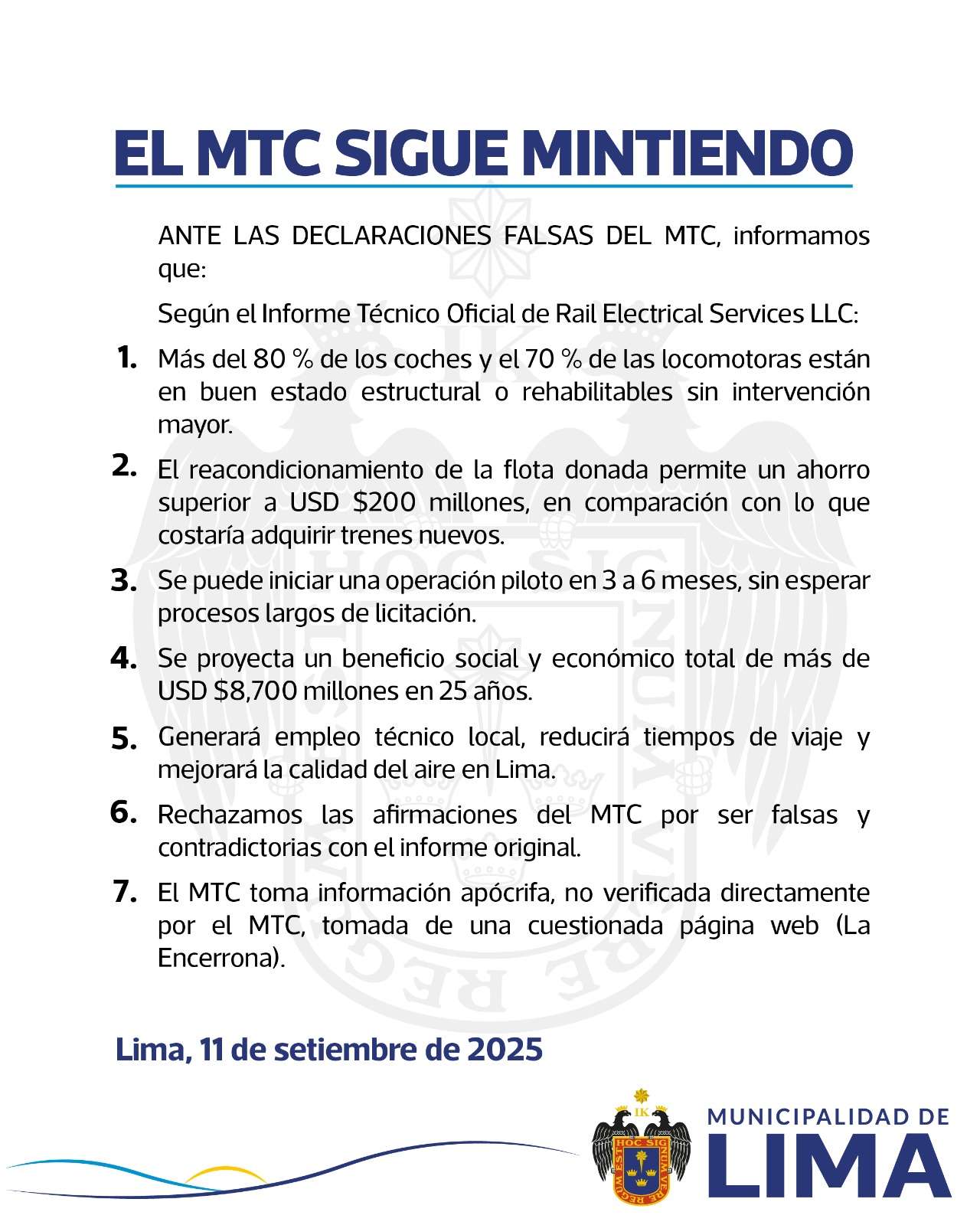 Tras la advertencia del Ministerio de Transportes y Comunicaciones (MTC) sobre presuntas fallas graves en los vagones y locomotoras del proyecto Tren Lima-Chosica, la Municipalidad de Lima emitió un comunicado en el que rechazó las observaciones y acusó al sector de difundir información “falsa y tergiversada”.