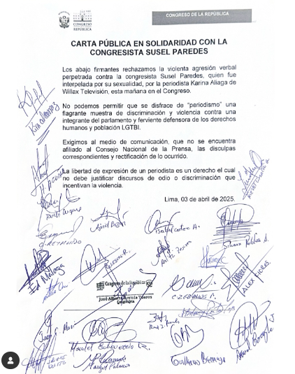 “Los abajo firmantes rechazamos la violenta agresión verbal perpetrada contra la congresista Susel Paredes, quien fue interpelada por su sexualidad. No podemos permitir que se disfrace de periodismo una flagrante muestra de discriminación y violencia“, se menciona en el comunicado.