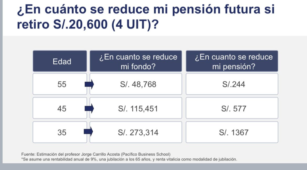 Carrillo presentó data que detalla cómo podría afectar a los afiliados retirar en diferentes etapas de sus vidas 4 UIT (S/ 20.600), asumiendo una rentabilidad anual de 9%, una jubilación a los 65 años y renta vitalicia como modalidad de jubilación.