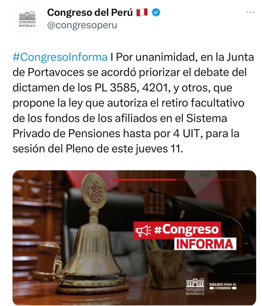 Según información compartida por las redes sociales del Poder Legislativo, la sesión del pleno se realizará el jueves 11 de abril. Ahí se debatirán los dictámenes de los PL 3585,4201, y otros, que propone la ley que autoriza el retiro facultativo de los fondos de los afiliados en el Sistema Privado de Pensiones hasta por 4 UIT.