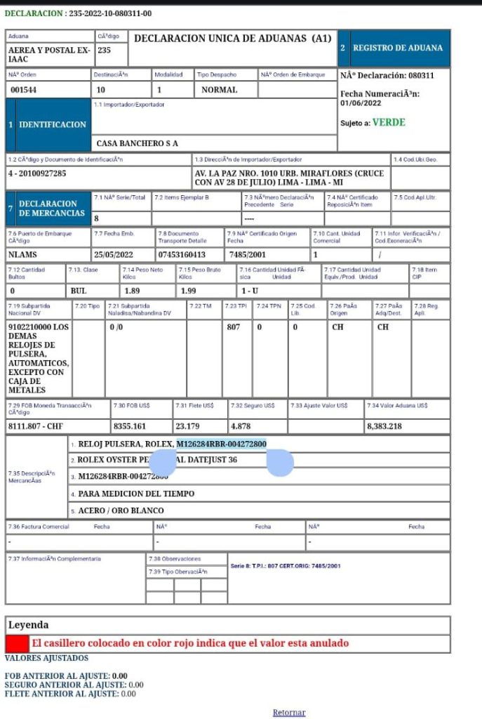 De acuerdo a la Declaración Única de Aduanas, el reloj de Boluarte fue comprado en el país y, posteriormente, importado por la única empresa que tiene la autorización: Casa Bancheros S. A.