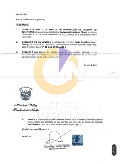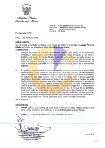 El 13 de marzo, el fiscal Luis Germaná, coordinador del Área Especializada en Denuncias Constitucionales, respondió que “no obra en la carpeta fiscal ni en los cuadernos incidentales, declaración testimonial de fecha 7 de febrero del 2023 a nombre de Sada Goray”. Además, que el levantamiento de su identidad debía ser a través de un pedido expreso de ella, señalando las razones.