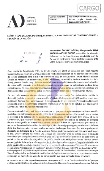 El pasado 12 de marzo, el abogado de Goray presentó ante la Fiscalía de Enriquecimiento Ilícito y Denuncias Constitucionales una solicitud para que le entreguen una copia de la declaración de Goray y que se levante la reserva de su identidad como testigo protegida.