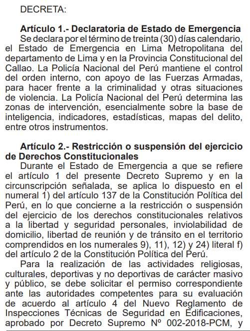 DECRETO SUPREMO SOBRE EL ESTADO DE EMERGENCIA EN LIMA Y CALLAO