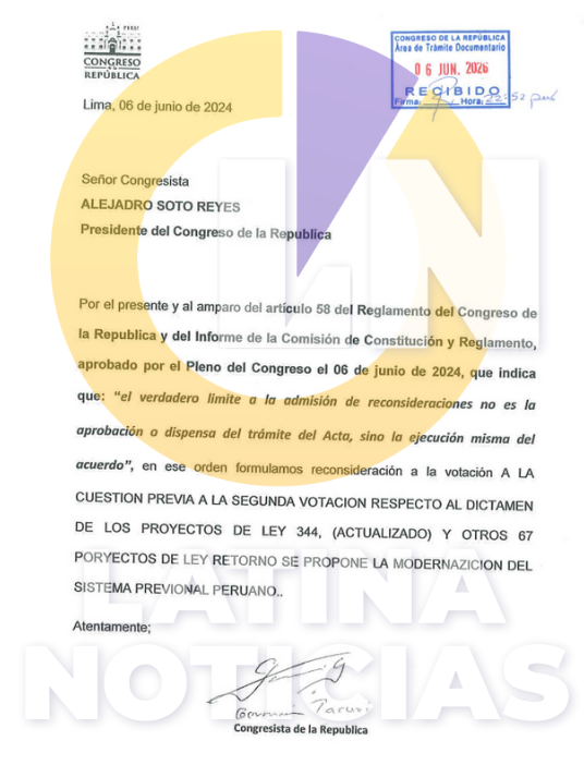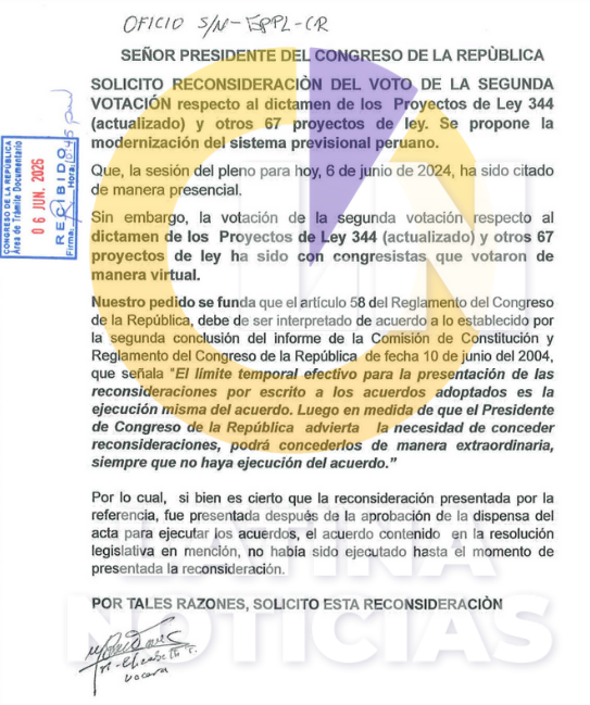 Latina Noticias accedió a ambos documentos que tienen como promotores a los legisladores Germán Tacuri (Bloque Magisterial) y Elizabeth Taipe (Perú Libre), quienes sustentaron sus peticiones en base al artículo 58 del Reglamento del Parlamento y a un informe de la Comisión de Constitución y Reglamento del 10 de junio del 2004.