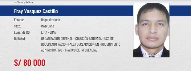 Fray Vásquez Castillo, sobrino del expresidente Pedro Castillo, se entregó a la justicia luego de permanecer prófugo durante casi dos años. La noticia fue confirmada por la policía y el Equipo especial de fiscales contra la corrupción (Eficcop). Por información que llevara a su captura, el Gobierno ofrecía 80 mil soles.