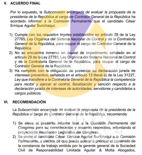 Según el informe final de este grupo de trabajo, al que Latina Noticias tuvo acceso, Aguilar cumple con los requisitos legales establecidos en el artículo 28 de la Ley orgánica de la mencionada entidad fiscalizadora. Además, no cuenta con ningún impedimento para ejercer como contralor y presentó su declaración jurada de intereses preventivo.