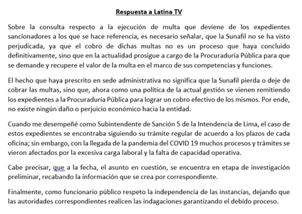 La SUNAFIL emitió un comunicado como respuesta a Latina Noticias, puntualizando que la Procuraduría de la institución aún intenta cobrar las multas. Además de que el retraso en el trámite de estos expedientes se debió a que con la llegada del “COVID-19, muchos procesos y trámites se vieron afectados por la excesiva carga laboral y la falta de capacidad operativa”.