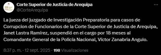 El Poder Judicial, por intermedio de la jueza Janet Lastra Ramírez del juzgado de Investigación Preparatoria para casos de Corrupción de Funcionarios de la Corte Superior de Justicia de Arequipa, suspendió en el cargo por 18 meses al comandante general de la Policía Nacional, Víctor Zanabria.
