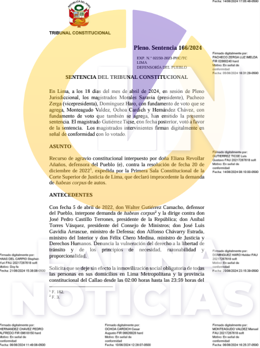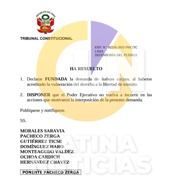 La decisión de los magistrados del TC se da tras declarar fundada la demanda de habeas corpus presentada por el exdefensor del Pueblo, Walter Gutiérrez, contra Castillo, el expremier Aníbal Torres, los exministros José Luis Gavidia (Defensa), Alfonso Chávarry (Interior) y Félix Chero (Justicia y Derechos Humanos).