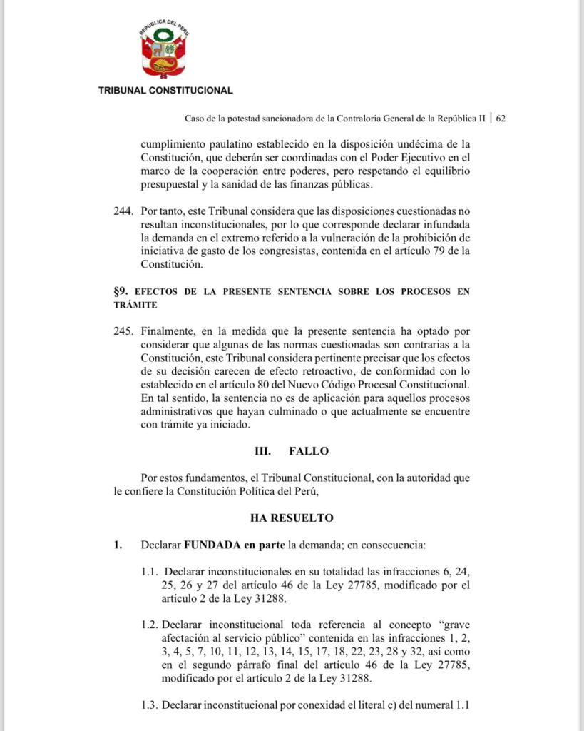 El TC declaró inconstitucionales en su totalidad las infracciones por incumplimiento funcional 6, 24, 25, 26 y 27 del artículo 46 de la Ley 27785, modificado por el artículo 2 de la Ley 31288. También se declaró inconstitucional por conexidad el literal c) del numeral 1.1 del artículo 68 del Reglamento del Procedimiento Administrativo Sancionador por Responsabilidad Administrativa Funcional, aprobado por Resolución de Contraloría 166-2021-CG.