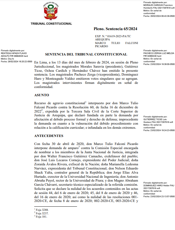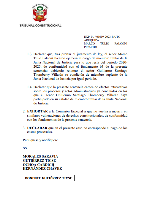 Según el fallo, el TC concedió el recurso de agravio constitucional que Falconí interpuso luego que en el 2020 haya sido seleccionado y convocado a juramentar en la JNJ. Sin embargo, a horas de la ceremonia protocolar es que le comunicaron que ya no lo haría.
