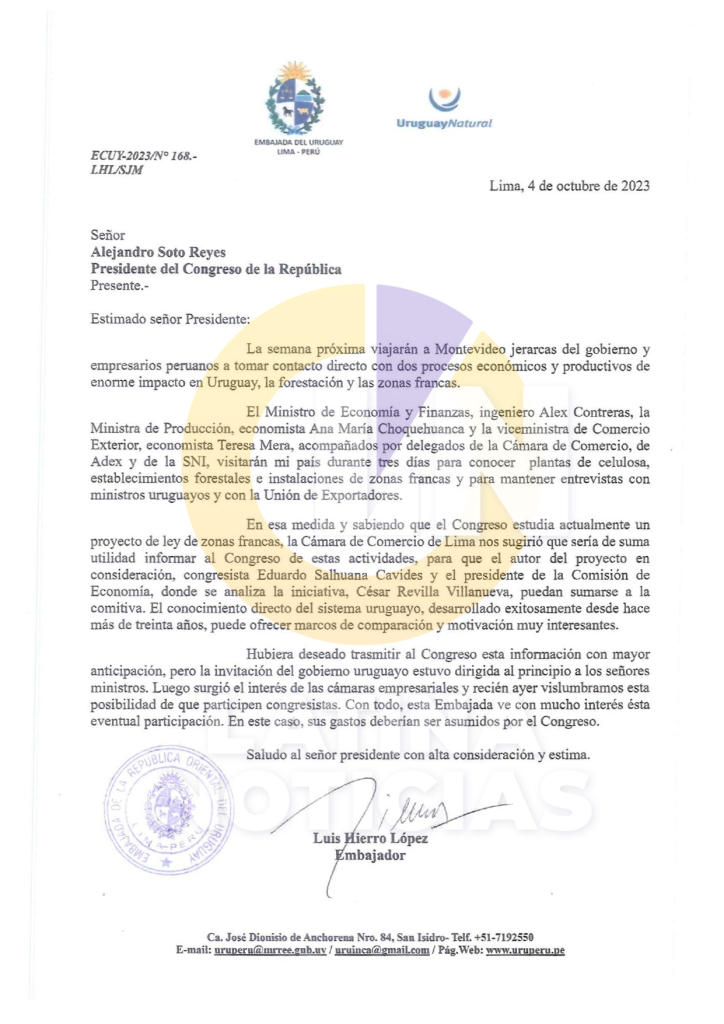 “La embajada ve con mucho interés esta eventual participación. En este caso, sus gastos deberían ser asumidos por el Congreso”, señala el documento firmado por el embajador de Uruguay en el Perú, Luis Hierro López.