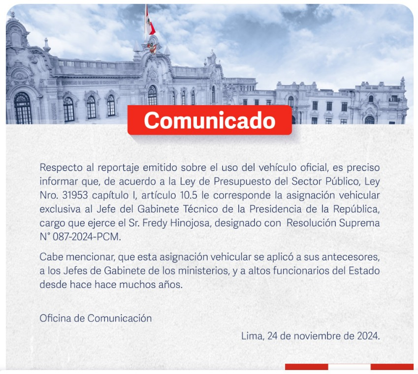 “Le corresponde la asignación vehicular exclusiva al Jefe del Gabinete Técnico de la Presidencia de la República, cargo que ejerce el Sr. Fredy Hinojosa, designado con Resolución Suprema N° 087-2024-PCM”, se lee en el pronunciamiento.
