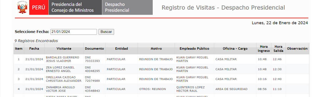 El general Víctor Zanabria asistió la mañana del domingo 21 de enero a Palacio de Gobierno, según lo confirmó este medio en el portal de Transparencia de esa entidad.