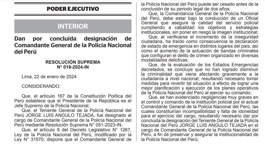 En la resolución suprema publicada en el diario El Peruano, se da cuenta de que se da por concluida la designación de Jorge Ángulo en la comandancia general de la Policía, tras la evaluación del gobierno de los estados de emergencia decretados a nivel nacional: “se concluye que no han logrado disminuir la criminalidad que viene afectando gravemente a la ciudadanía a nivel nacional; resultando necesario tomar medidas para revertir tal situación a efecto de lograr una mejor planificación y ejecución de los planes operativos de la Policía Nacional del Perú al ejercer su comando”.