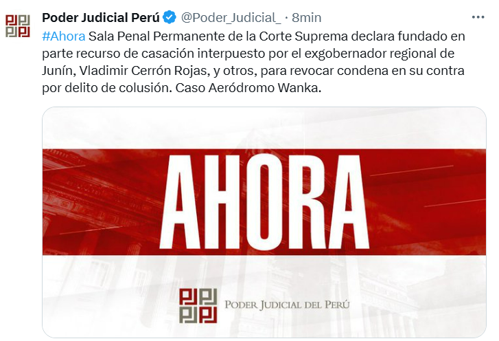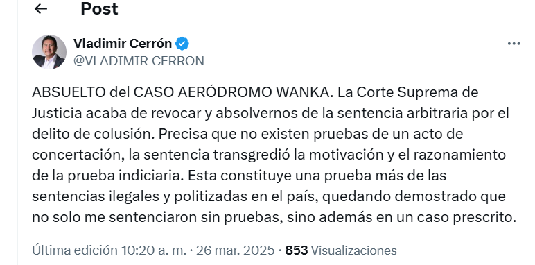 El Poder Judicial del Perú absolvió al líder de Perú Libre, Vladimir Cerrón, en el marco del caso conocido como Aeródromo Wanka. La resolución fue emitida por la Sala Penal Permanente de la Corte Suprema de Justicia, que determinó que no se había demostrado el delito de colusión simple, motivo por el cual Cerrón Rojas había sido condenado a una pena de tres años y seis meses.