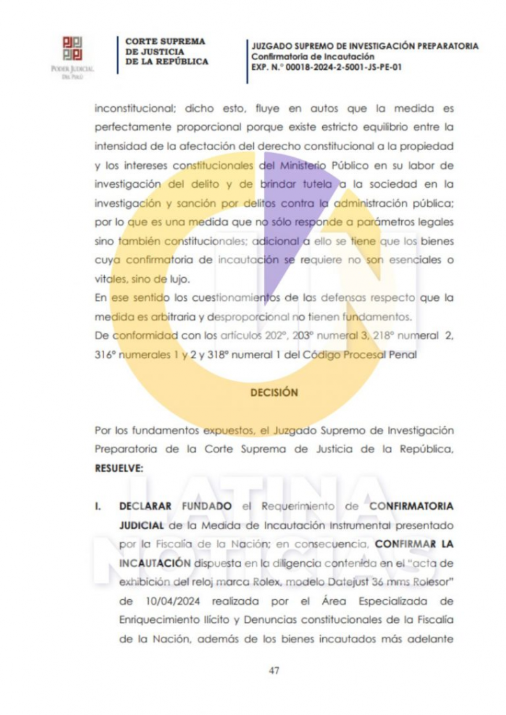 «La decisión fue adoptada por el Juzgado Supremo de Investigación Preparatoria, a cargo del juez supremo Juan Carlos Checkley Soria, al existir la posibilidad de que estos bienes sean ocultados si se levanta la medida«, señala el PJ a través de la red social X, antes Twitter.