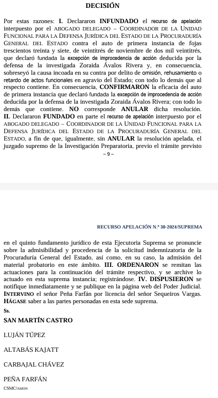 “Declararon infundado el recurso de apelación interpuesto por la Procuraduría General del Estado contra el auto de primera instancia… que declaró fundada la excepción de improcedencia de acción deducida por la defensa de la investigada Zoraida Ávalos Rivera y, en consecuencia, sobreseyó la causa incoada en su contra por delito de omisión, rehusamiento o retardo de actos funcionales en agravio del Estado; con todo lo demás que al respecto contiene”, se lee en el documento.