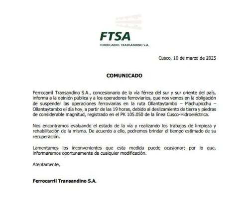 En la noche del lunes 10 de marzo, la empresa Ferrocarril Transandino S.A., concesionario de la vía férrea del sur y sur oriente del país, anunció, a través de un comunicado, la suspensión de las operaciones ferroviarias en la ruta Ollantaytambo – Machu Picchu – Ollantaytambo desde las 19:00 horas.