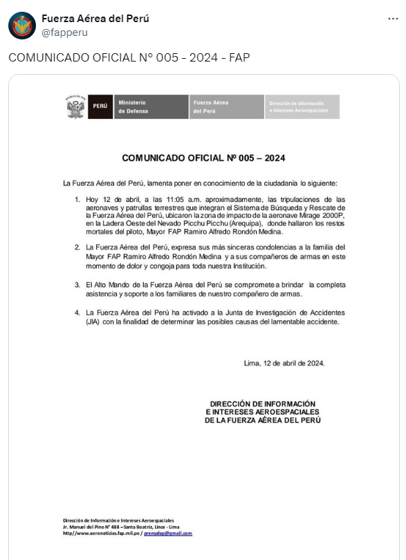 “Hoy 12 de abril, a las 11: 05 a.m., aproximadamente, las tripulaciones de las aeronaves y patrullas terrestres que integran el Sistema de Búsqueda y Rescate de la Fuerza Aérea del Perú, ubicaron la zona de impacto de la aeronave Mirage 200P, en la Ladera Oeste del Nevado Picchu Picchu (Arequipa), donde hallaron los restos mortales del piloto, Mayor FAP Ramiro Alfredo Rondón Medina”, se detalla en el mensaje.