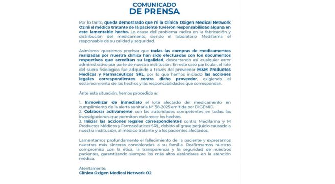 La clínica O2 Medical Network se ha deslindado de la responsabilidad, alegando que la muerte de Daniela se debió a un lote defectuoso de suero fisiológico proporcionado por el laboratorio Medifarma. Este suero, cuya inmovilización, fue ordenada por la Dirección General de Medicamentos, Insumos y Drogas (DIGEMID).