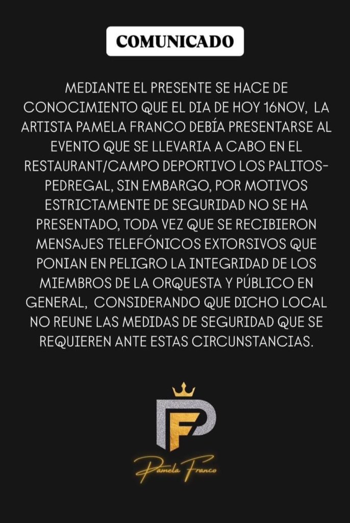 Pamela Franco y su orquesta emitieron un comunicado explicando que la cancelación se debió a la falta de garantías de seguridad en el local. En el texto, además, indicaron que la integridad de los miembros de la orquesta y del público corría peligro.