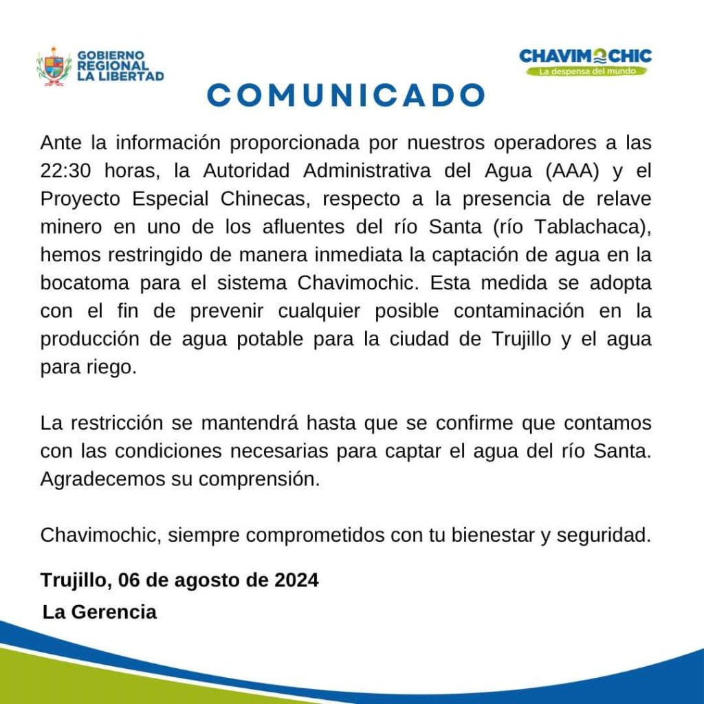 Los proyectos especiales de Chavimochic y Chinecas restringieron la captación de agua debido a la contaminación que se registra en el río Tablachaca, en la provincia de Pallasca, en Áncash, por el presunto relave minero producido hace unos días. Las aguas de este afluente se han coloreado de naranja y en algunas partes de amarillo. Vecinos de caseríos aledaños denunciaron la muerte de la flora y fauna.