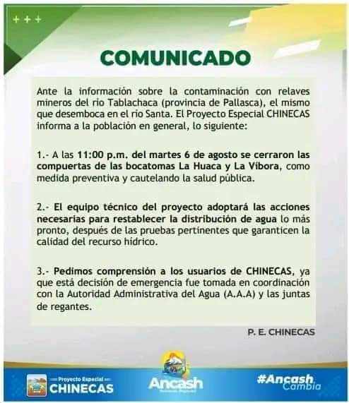 A través de la difusión de videos en redes sociales, vecinos de Pallasca alertaron sobre el daño ambiental que se registra en el río Tablachaca por su supuesto colapso de una unidad minera. Este afluente desemboca en el río Santa, por lo que de inmediato el Proyecto Especial Chinecas dispuso el cierre de las compuertas de las bocatomas La Huaca y La Víbora, como medida preventiva para cautelar la salud pública.