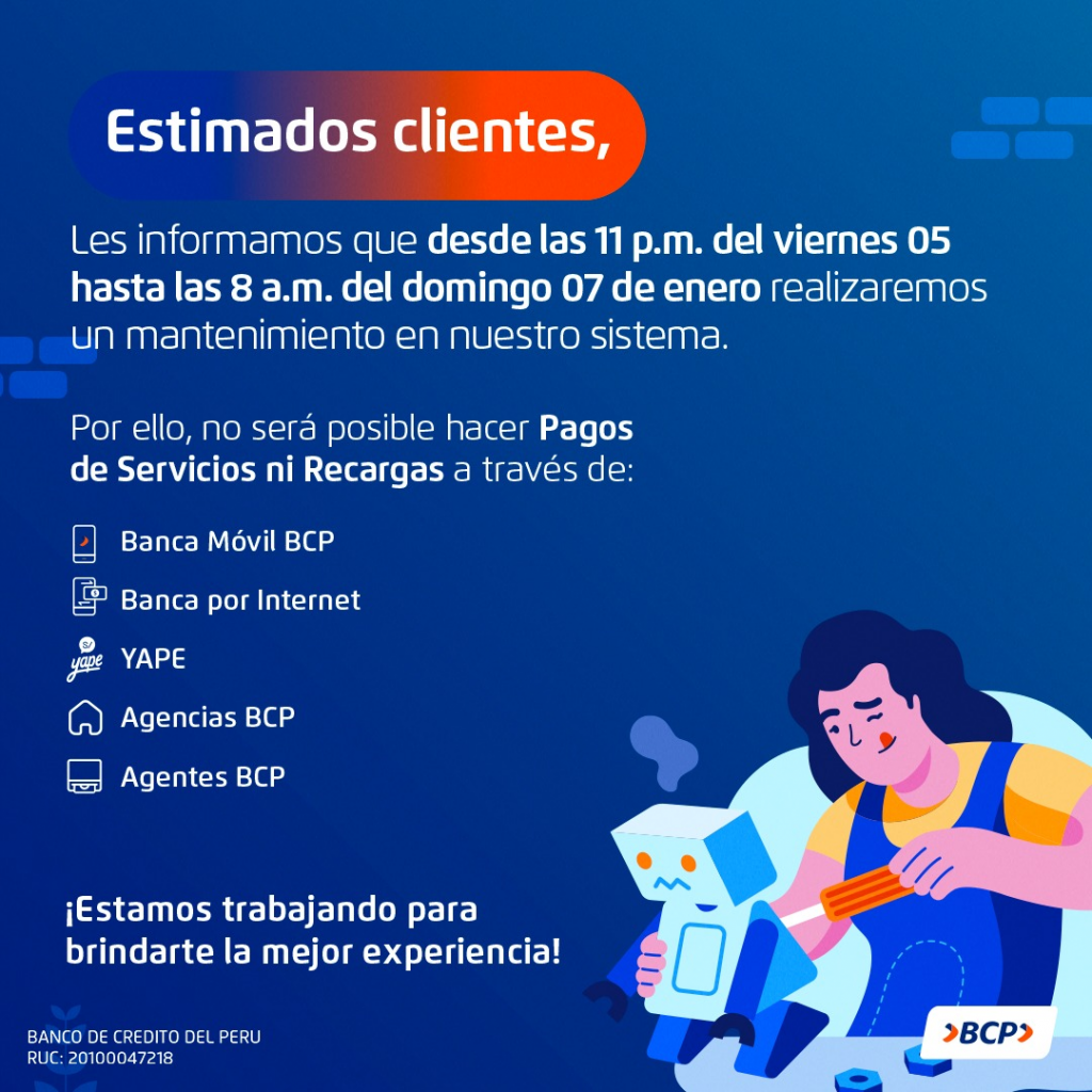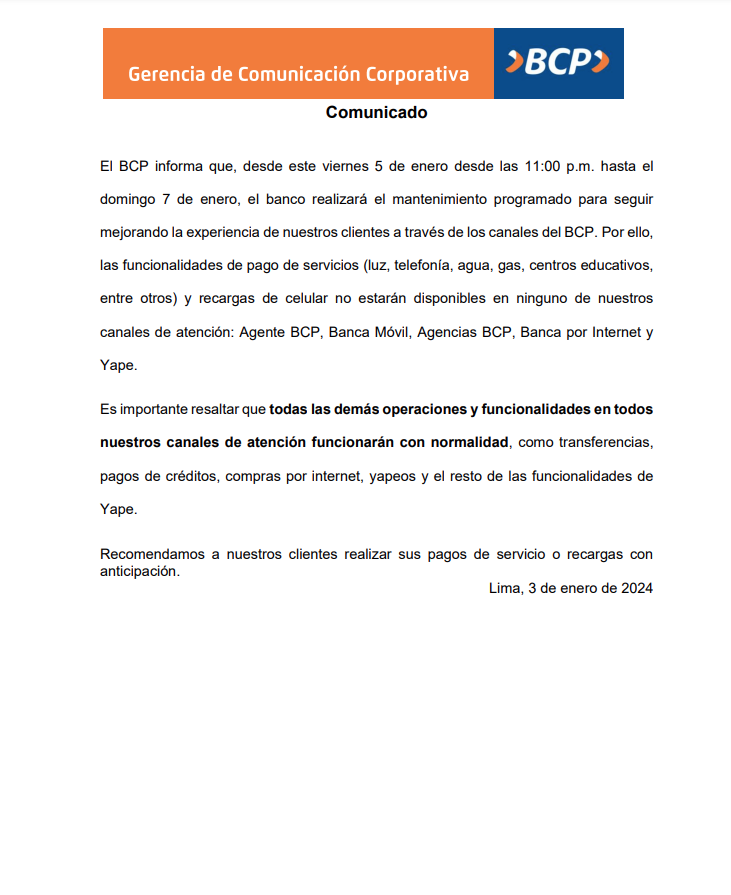 “El BCP informa que, desde este viernes 5 de enero desde las 11:00 p.m. hasta el domingo 7 de enero, el banco realizará el mantenimiento programado para seguir mejorando la experiencia de nuestros clientes a través de los canales del BCP. Por ello, las funcionalidades de pago de servicios (luz, telefonía, agua, gas, centros educativos, entre otros) y recargas de celular no estarán disponibles en ninguno de nuestros canales de atención: Agente BCP, Banca Móvil, Agencias BCP, Banca por Internet y Yape.” Se lee en el oficio.