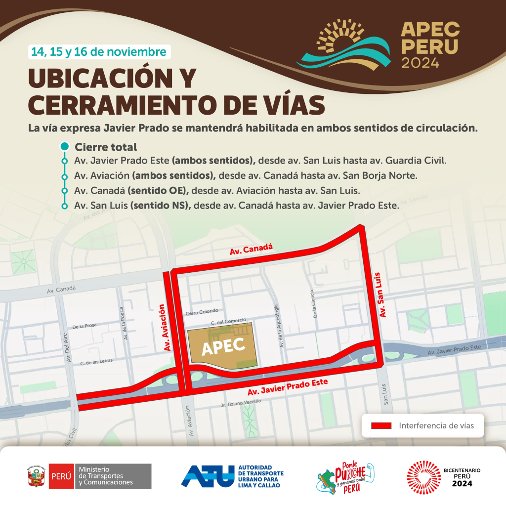 Según la Autoridad de Transporte Urbano (ATU) y la Policía Nacional del Perú (PNP), se cerrarán totalmente las av. Javier Prado Este (ambos sentidos), Aviación (ambos sentidos), Canadá (sentido oeste) y San Luis (sentido noroeste).