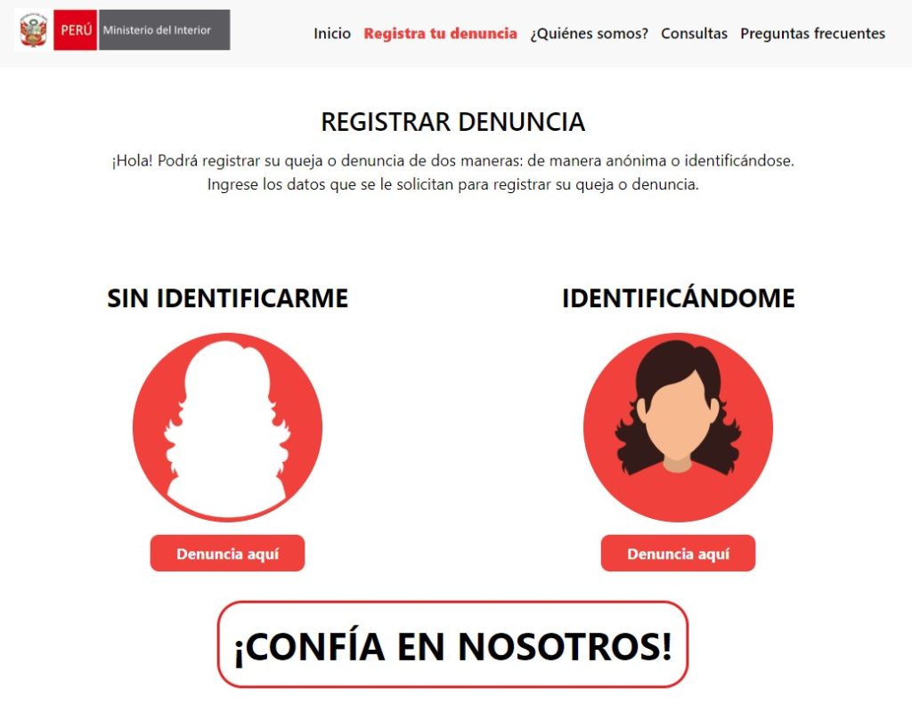 El proceso para presentar una denuncia por violencia contra la mujer es sencillo y confidencial. Primero, accede a esta plataforma digital del Mininter y, una vez allí, puedes elegir si deseas identificarte o no; en ambos casos, tu identidad será protegida.