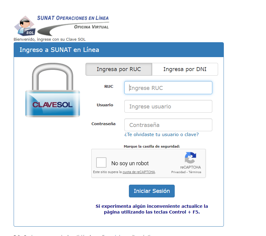 - Ya ubicado en la página, debes ingresar tu RUC, usuario, contraseña. Y no olvides dar cli en “No soy un robo” previó a pulsar “Iniciar Sesión”.