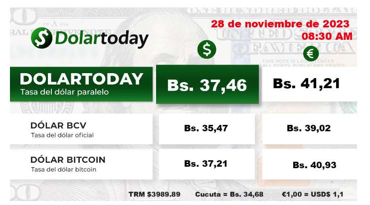 Hoy, martes 28 de noviembre, se han publicado diversas tasas para el dólar en Venezuela. DolarToday ha informado un valor de 37,46 bolívares para la divisa estadounidense, mientras que Monitor Dólar ha establecido un promedio de 37,01 bolívares.