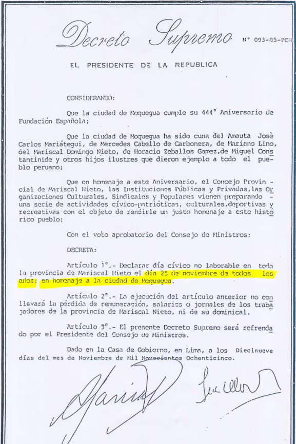 En 1985, el Gobierno declaró cada 25 de noviembre como ‘día cívico no laborable’ para conmemorar el aniversario de la fundación Española de Moquegua. “Declarar día cívico no laborable en toda la provincia de Mariscal Nieto, el día 25 de noviembre de todos los años; en homenaje a la ciudad de Moquegua”, se lee en el documento.